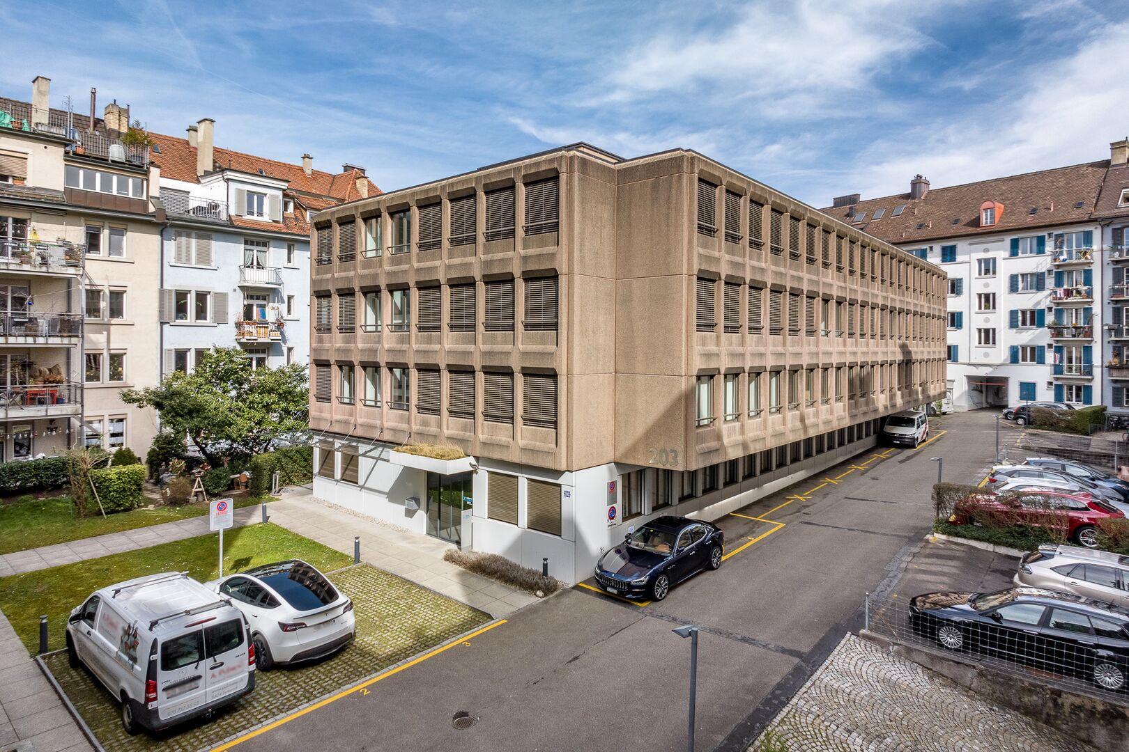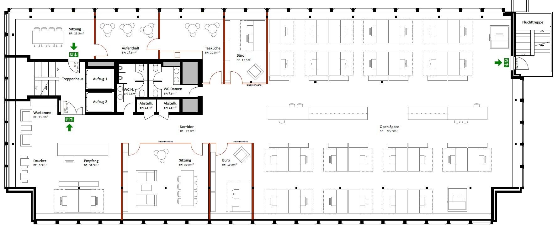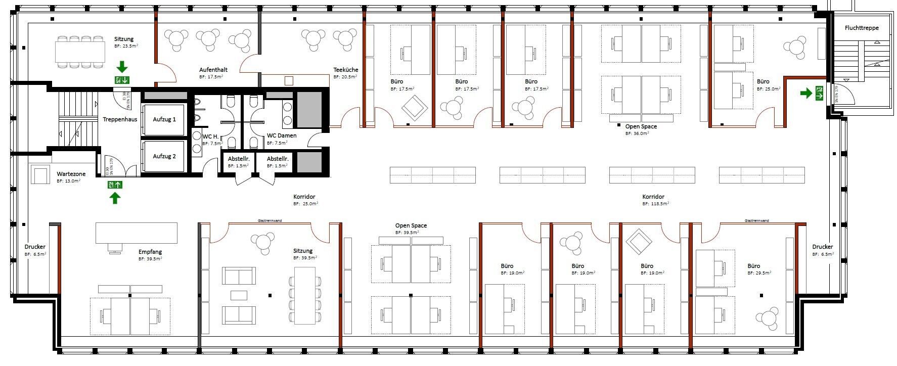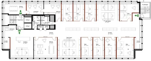 - Raumstruktur: Open Space (netto CHF 500/m² p.a.) oder Klein- und Einzelbüros (netto CHF 520/m² p.a.) – gemäss Planunterlagen